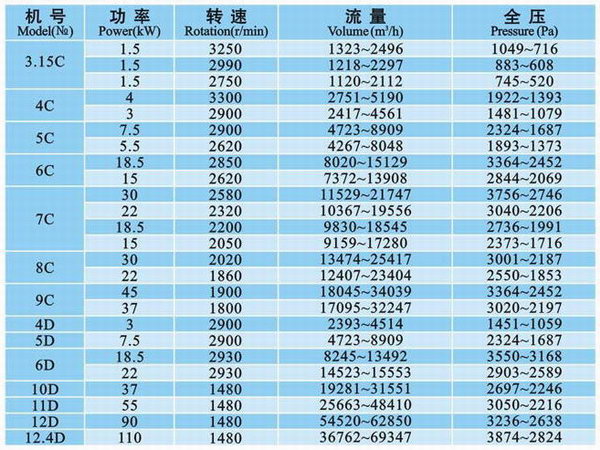 (1)引風(fēng)機(jī)制成單吸入,機(jī)號有№4、5、6、8、9、12、12.4七種。